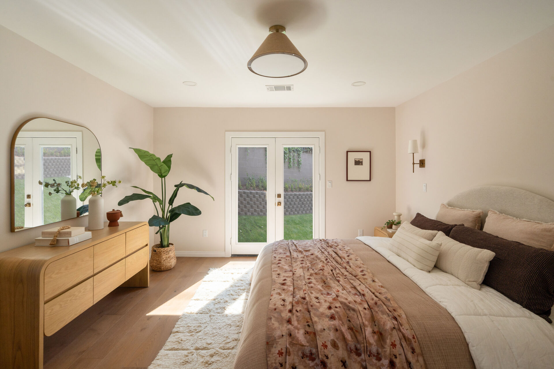 The main level primary suite is its own sanctuary, complete with a dual-vanity bath en suite, and features quartz vanities, new plumbing fixtures, and brand new tilework in the spacious shower. The primary accesses french doors to the grassy backyard for fresh air and sunlight. Two additional main level guest bedrooms offer modern lighting, ample size and great closet space.