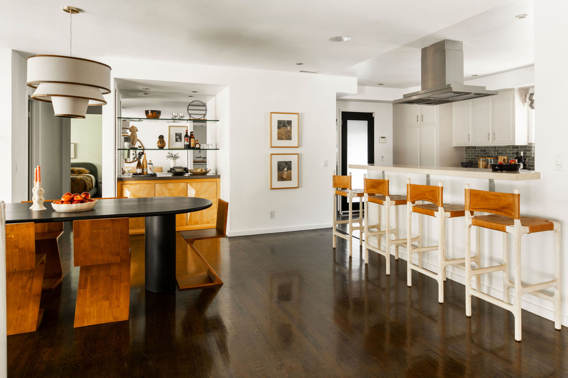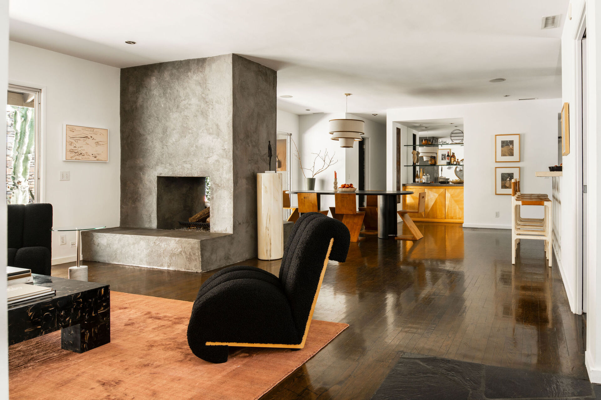 The entryway opens to a wide, light-filled layout anchored by rich dark wood floors and a full wall of glass that brings the outdoors in—true to mid-century ideals. The spacious living room flows into a generous dining area and a custom bar, with a sleek double-sided concrete fireplace offering warmth and subtle separation between spaces.