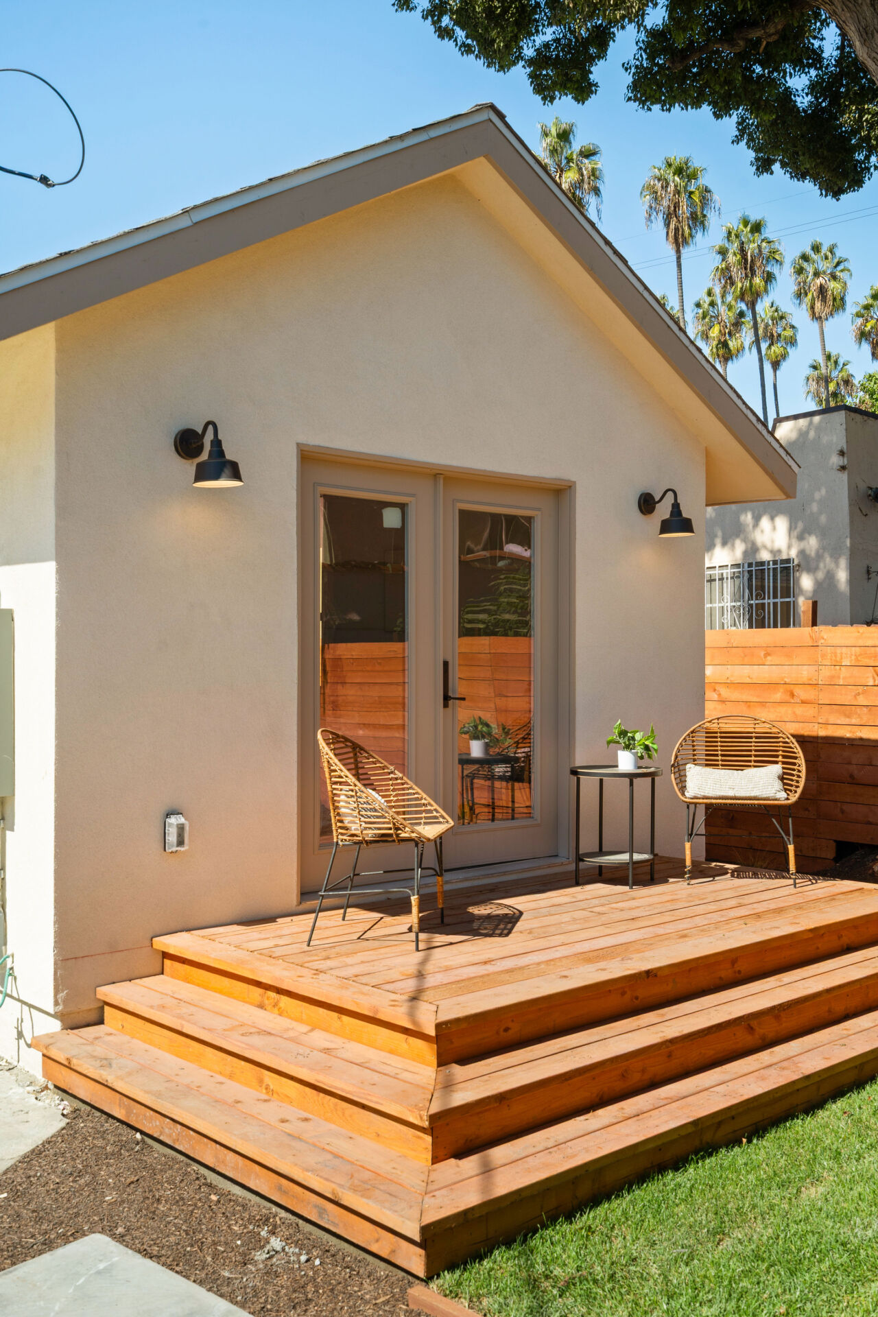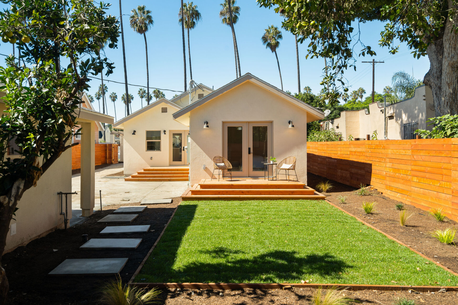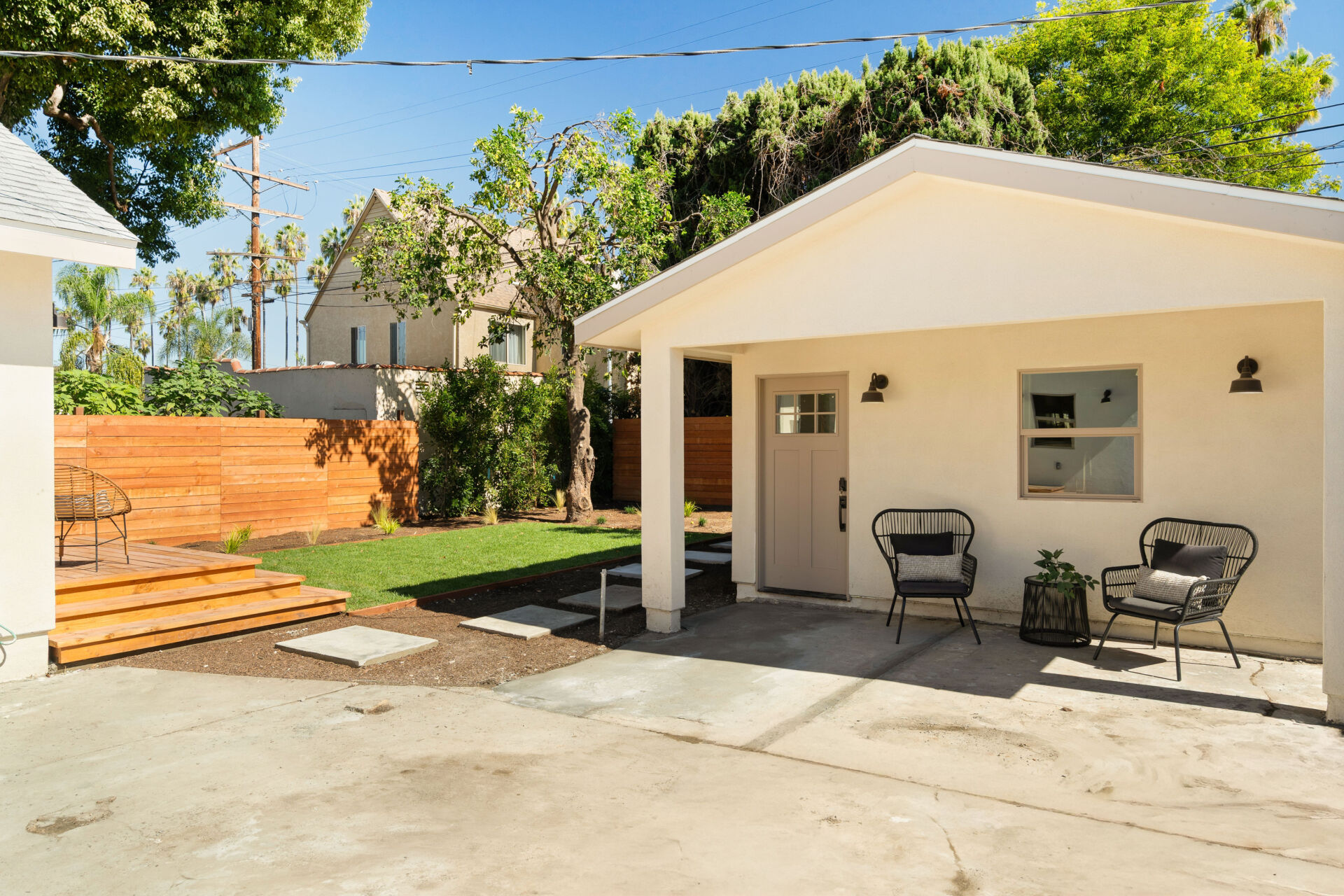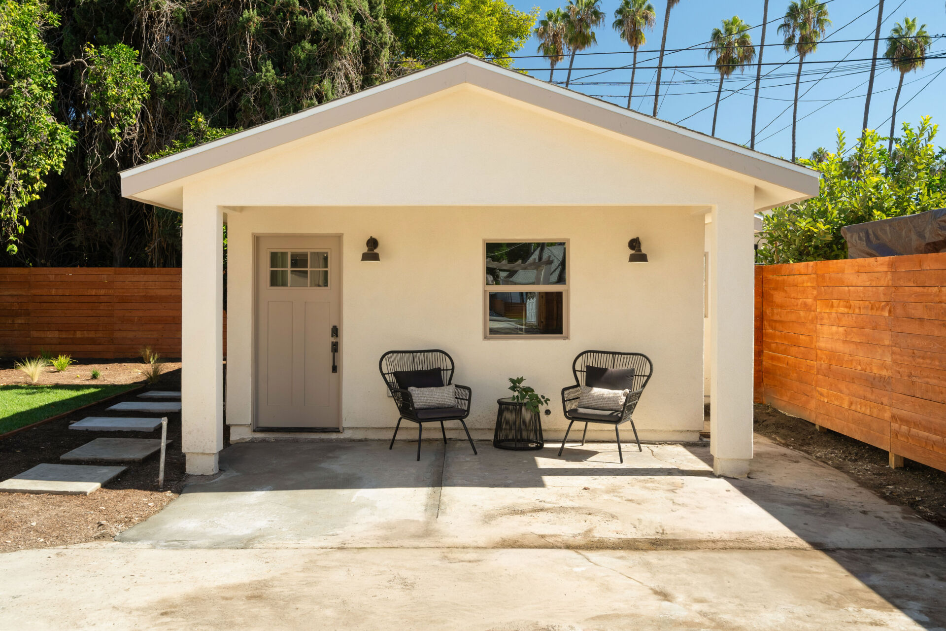 Three spacious bedrooms complete the space, including a primary suite with french doors leading to the garden. Indulge in self care in your private sanctuary, a true retreat with a spa-like bathroom with a dual vanity, newly tiled shower stall with a custom enclosure and separate soaking tub and walk-in closet nearby. The newly installed privacy fencing encases the sprawling yard space, creating a private haven for enjoyment. No expense was spared on the guest house, a permitted ADU with its own address – prime for income potential or visiting family + friends! Newly constructed, it enjoys all new systems including a 150-amp panel, it’s ready for your enjoyment. The kitchenette and full bath both enjoy high quality design aligned with the main home.