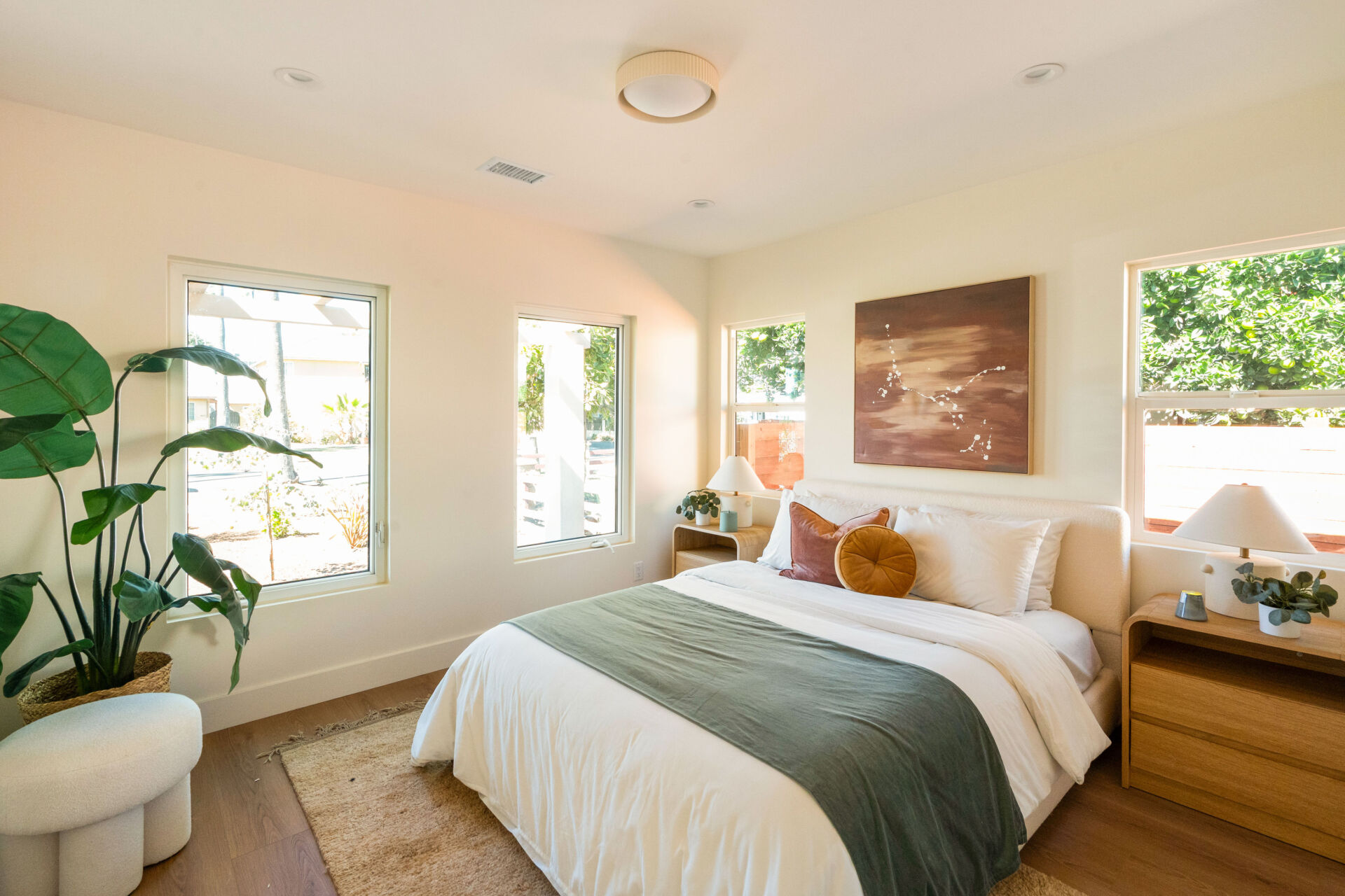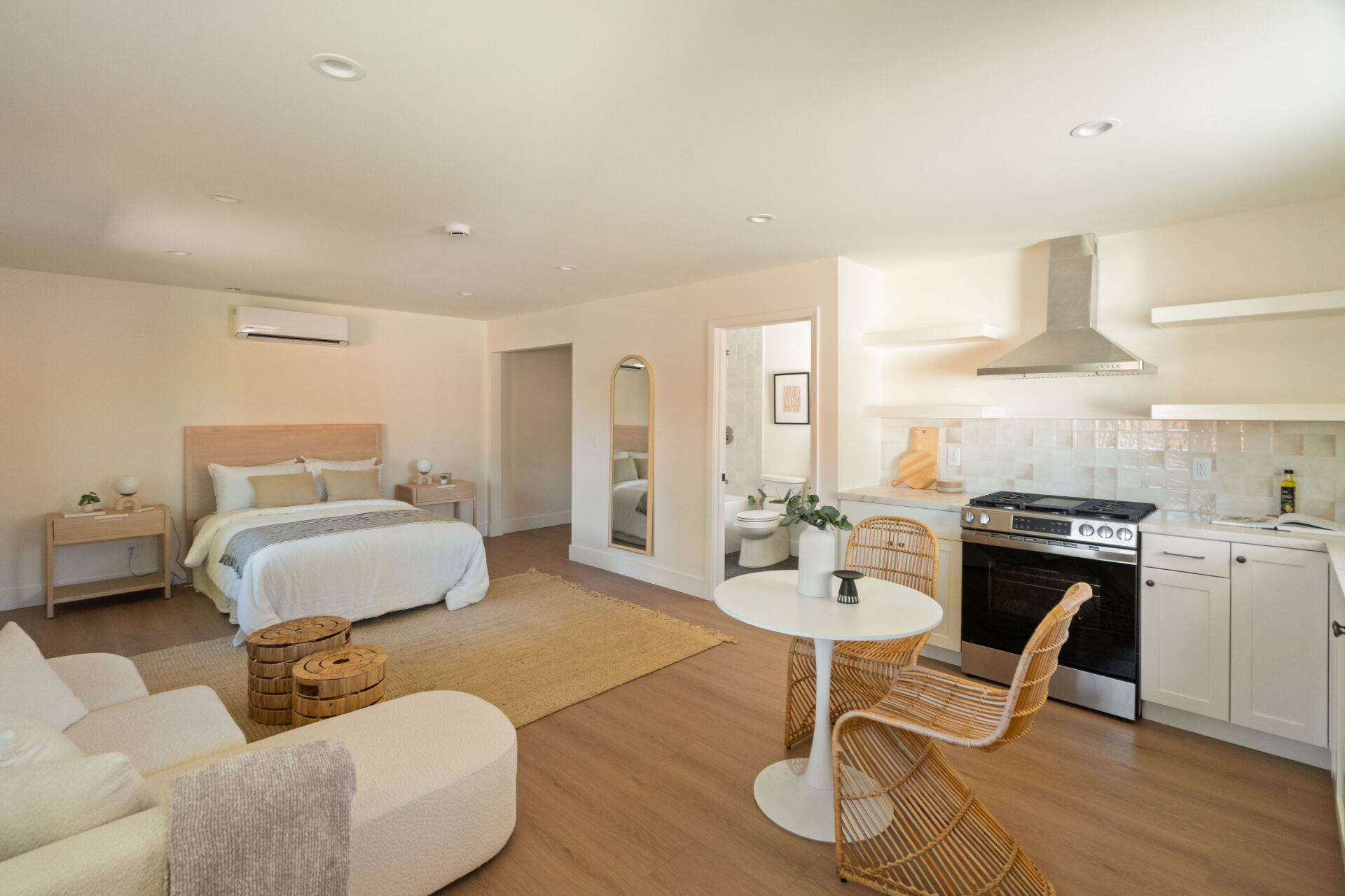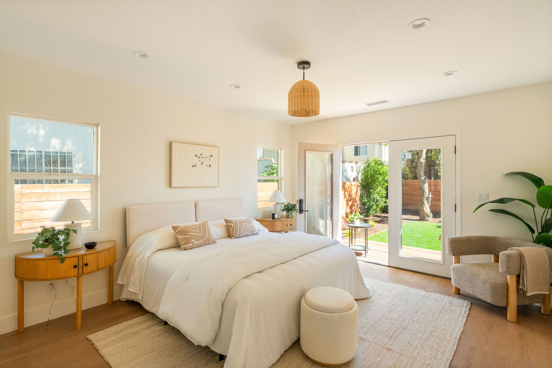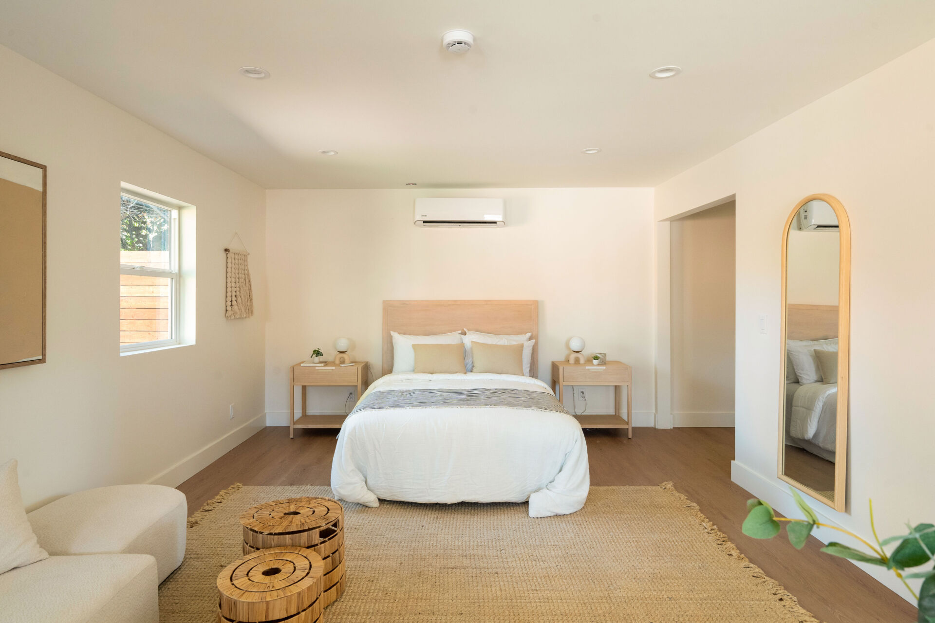 Three spacious bedrooms complete the space, including a primary suite with french doors leading to the garden. Indulge in self care in your private sanctuary, a true retreat with a spa-like bathroom with a dual vanity, newly tiled shower stall with a custom enclosure and separate soaking tub and walk-in closet nearby. The newly installed privacy fencing encases the sprawling yard space, creating a private haven for enjoyment. No expense was spared on the guest house, a permitted ADU with its own address – prime for income potential or visiting family + friends! Newly constructed, it enjoys all new systems including a 150-amp panel, it’s ready for your enjoyment. The kitchenette and full bath both enjoy high quality design aligned with the main home.