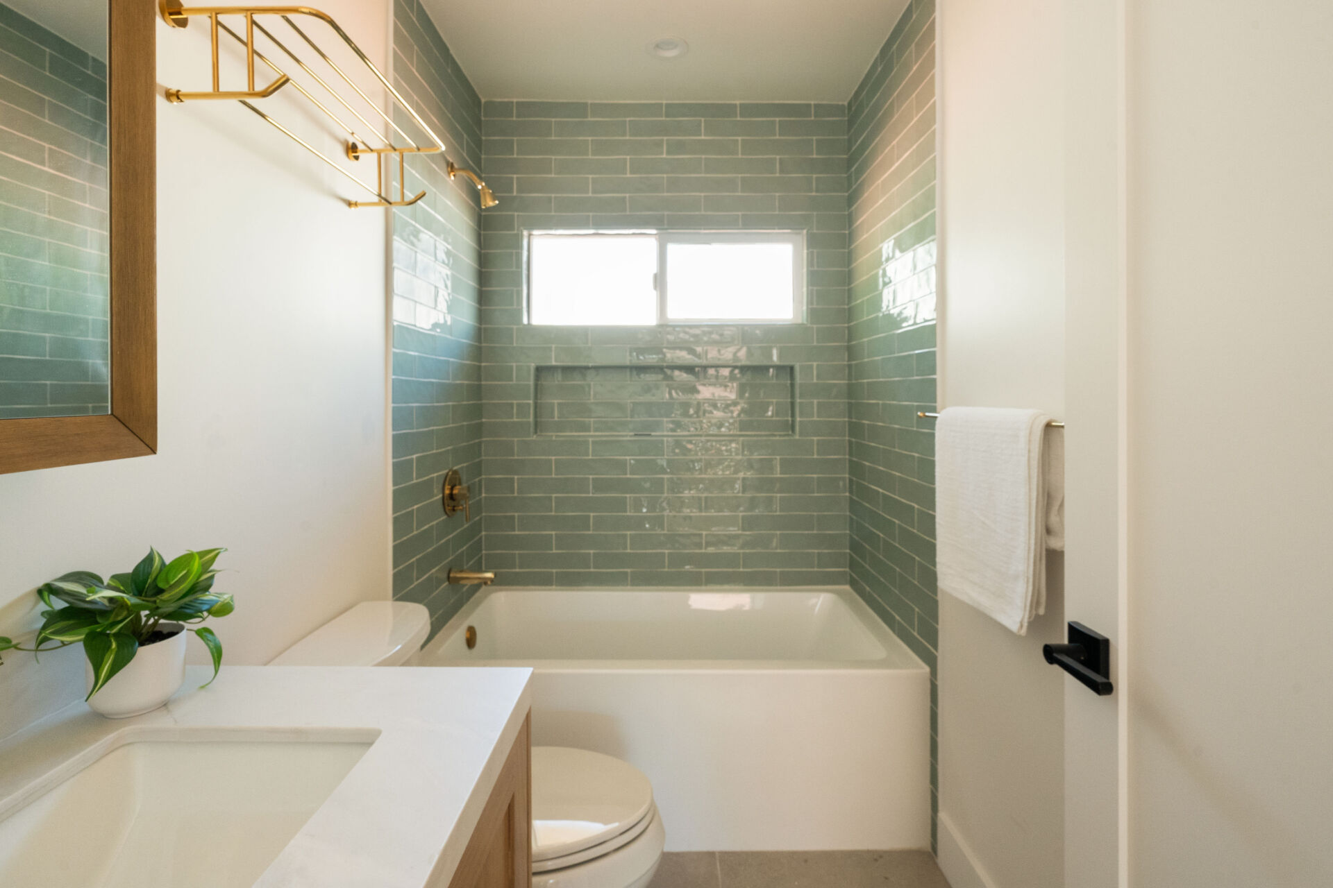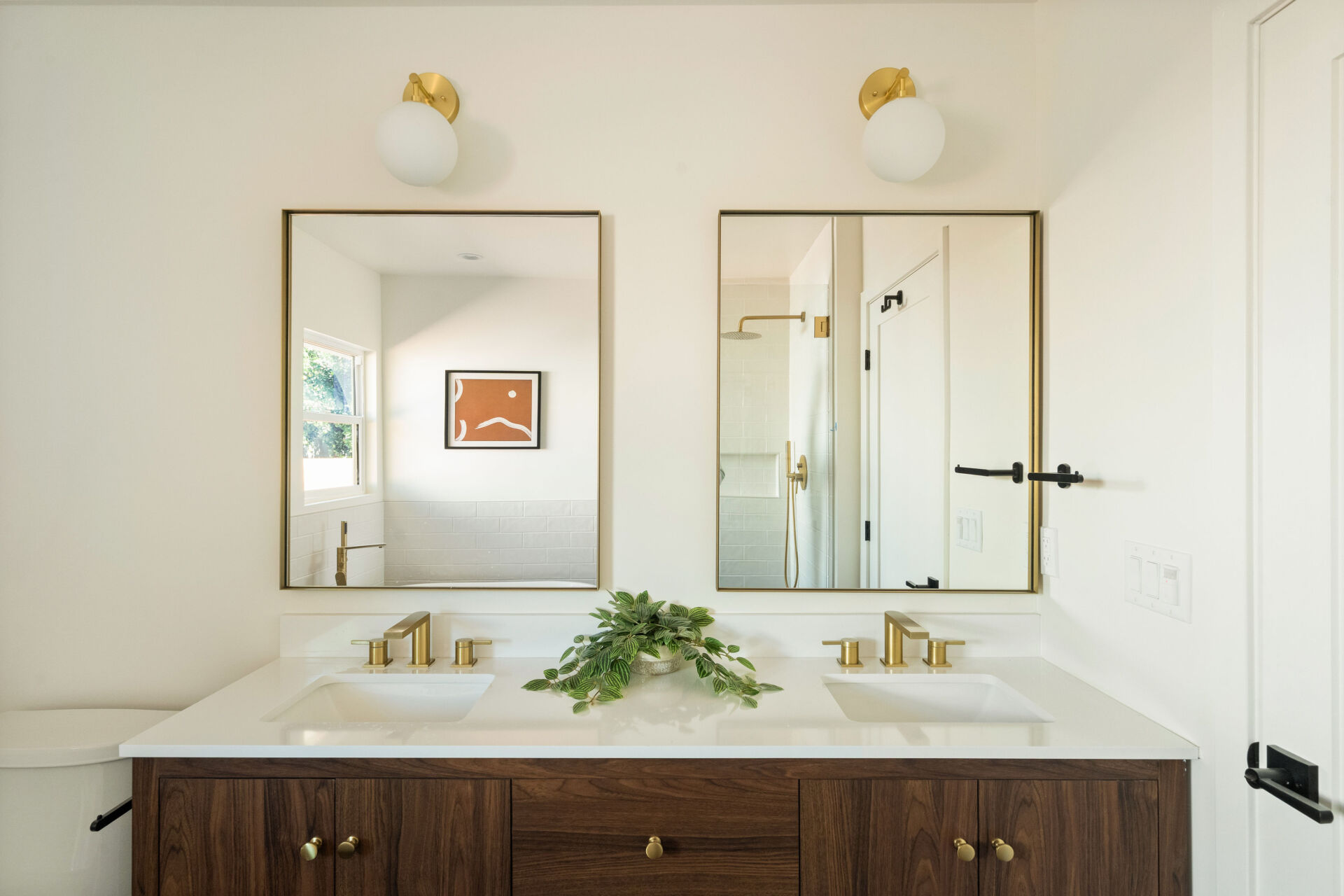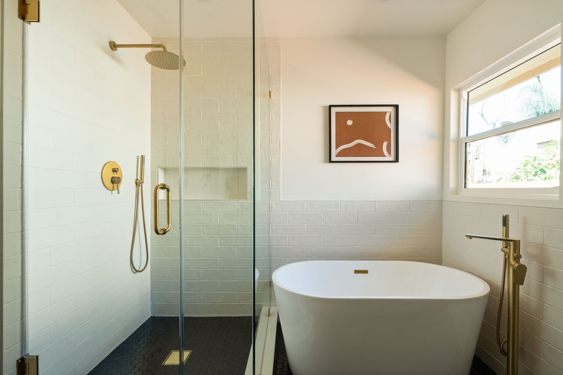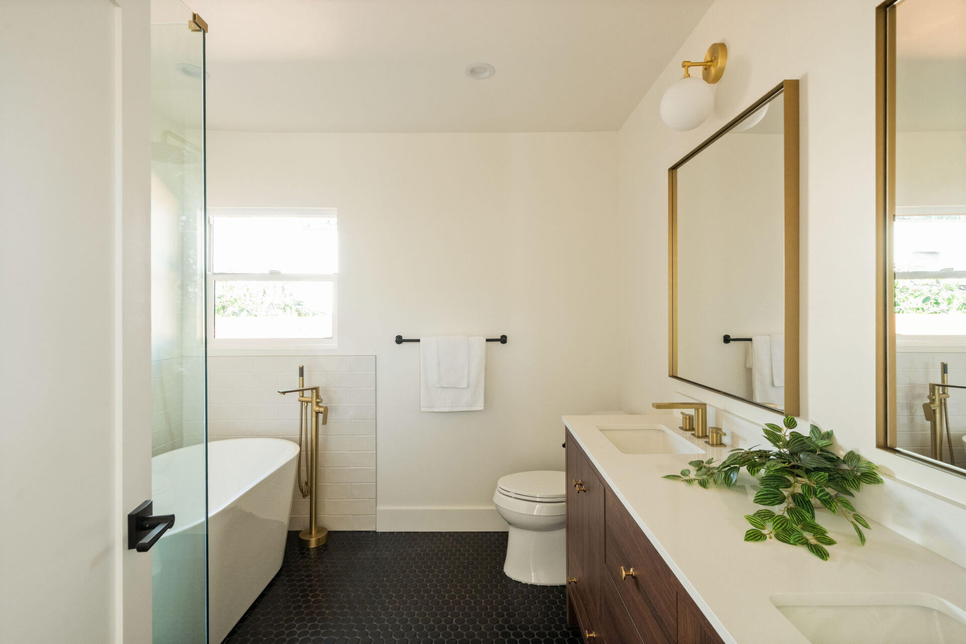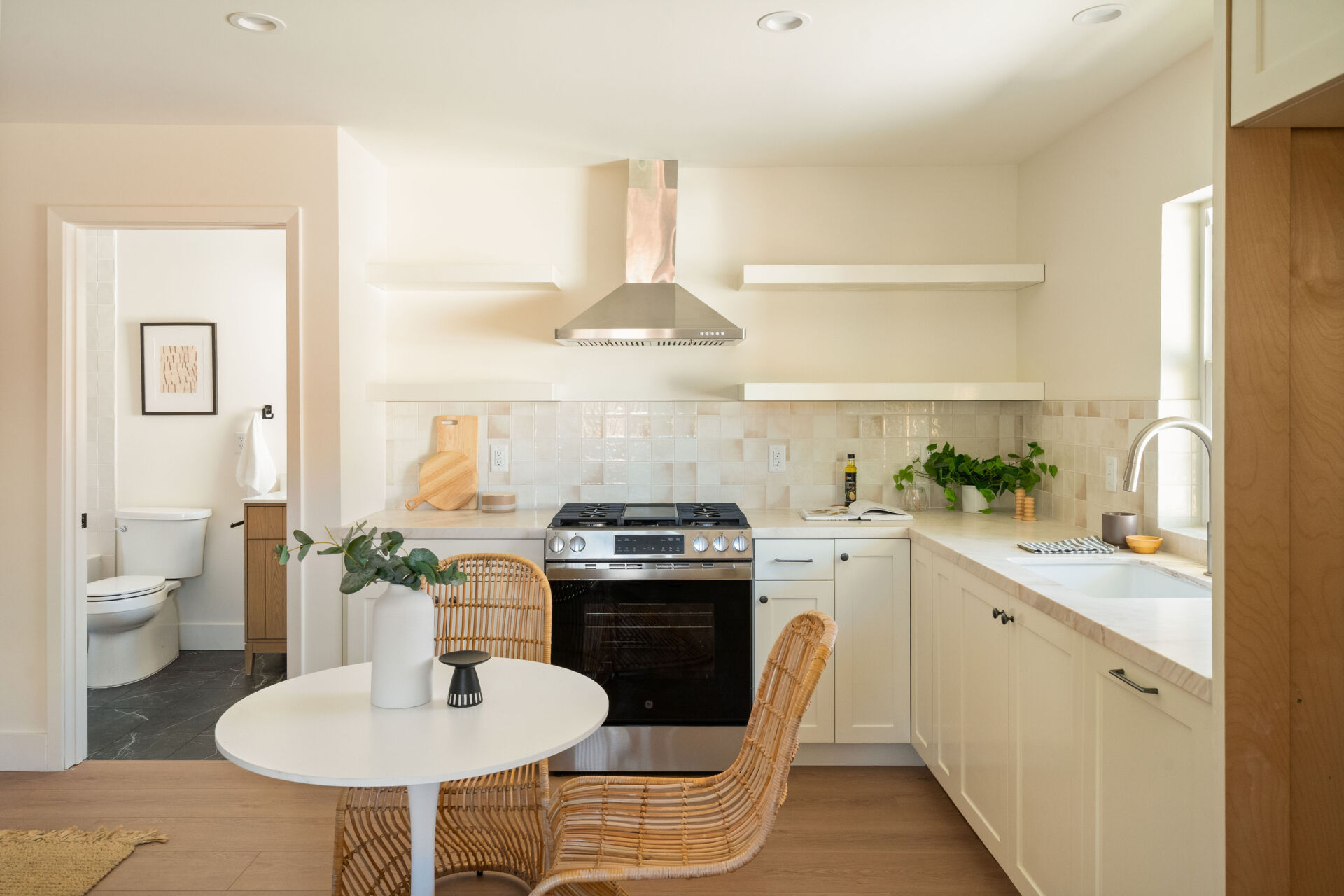 Three spacious bedrooms complete the space, including a primary suite with french doors leading to the garden. Indulge in self care in your private sanctuary, a true retreat with a spa-like bathroom with a dual vanity, newly tiled shower stall with a custom enclosure and separate soaking tub and walk-in closet nearby. The newly installed privacy fencing encases the sprawling yard space, creating a private haven for enjoyment. No expense was spared on the guest house, a permitted ADU with its own address – prime for income potential or visiting family + friends! Newly constructed, it enjoys all new systems including a 150-amp panel, it’s ready for your enjoyment. The kitchenette and full bath both enjoy high quality design aligned with the main home.