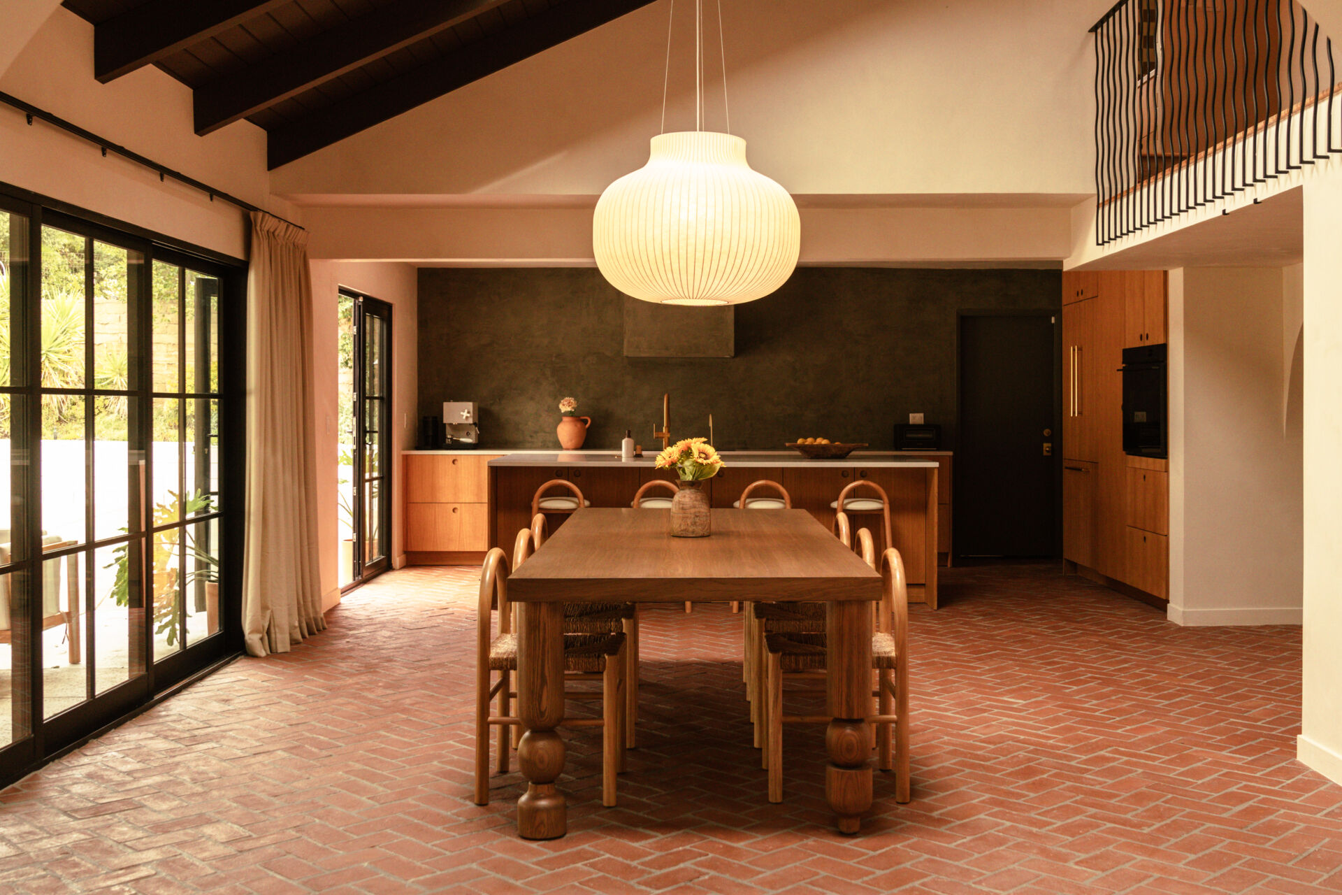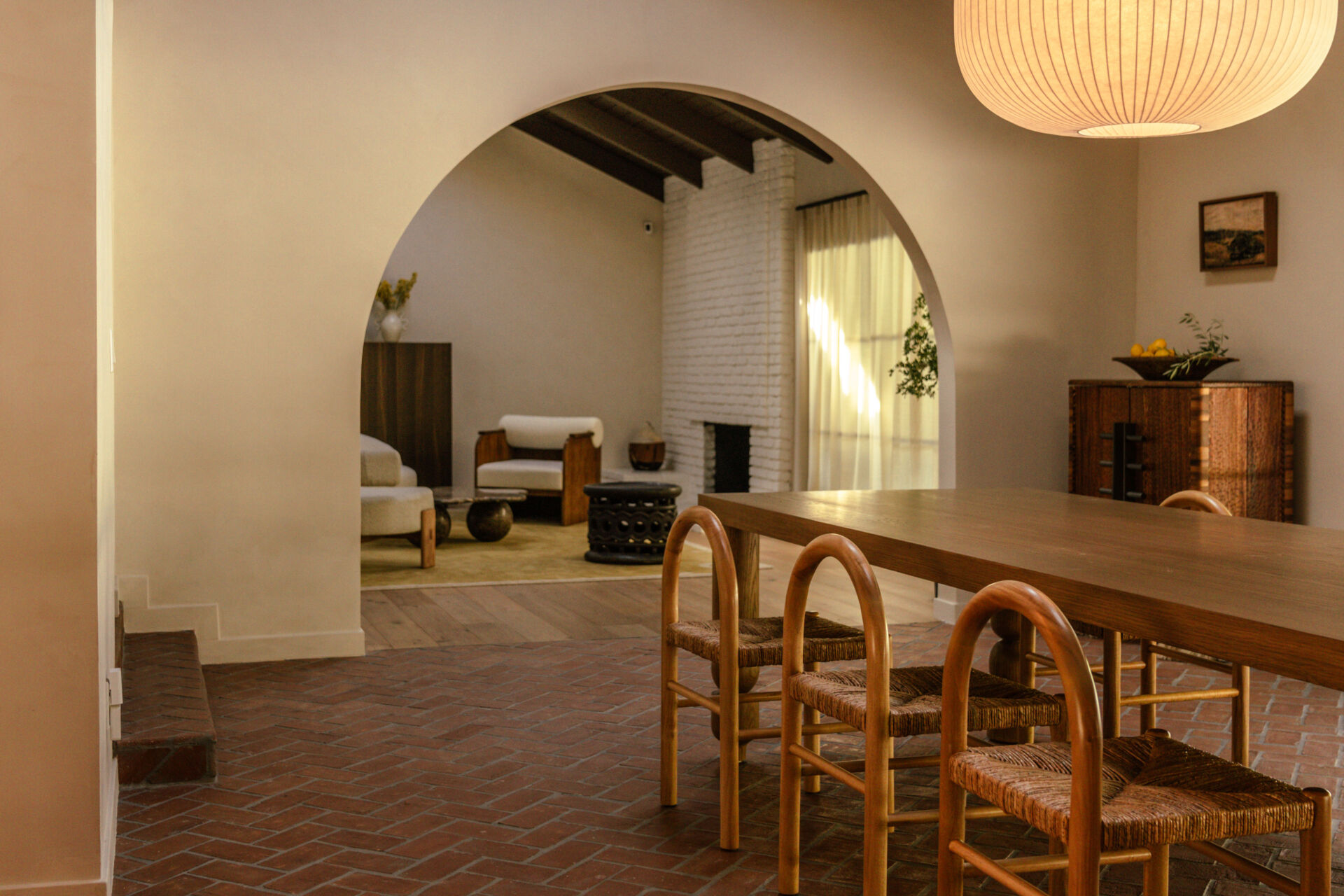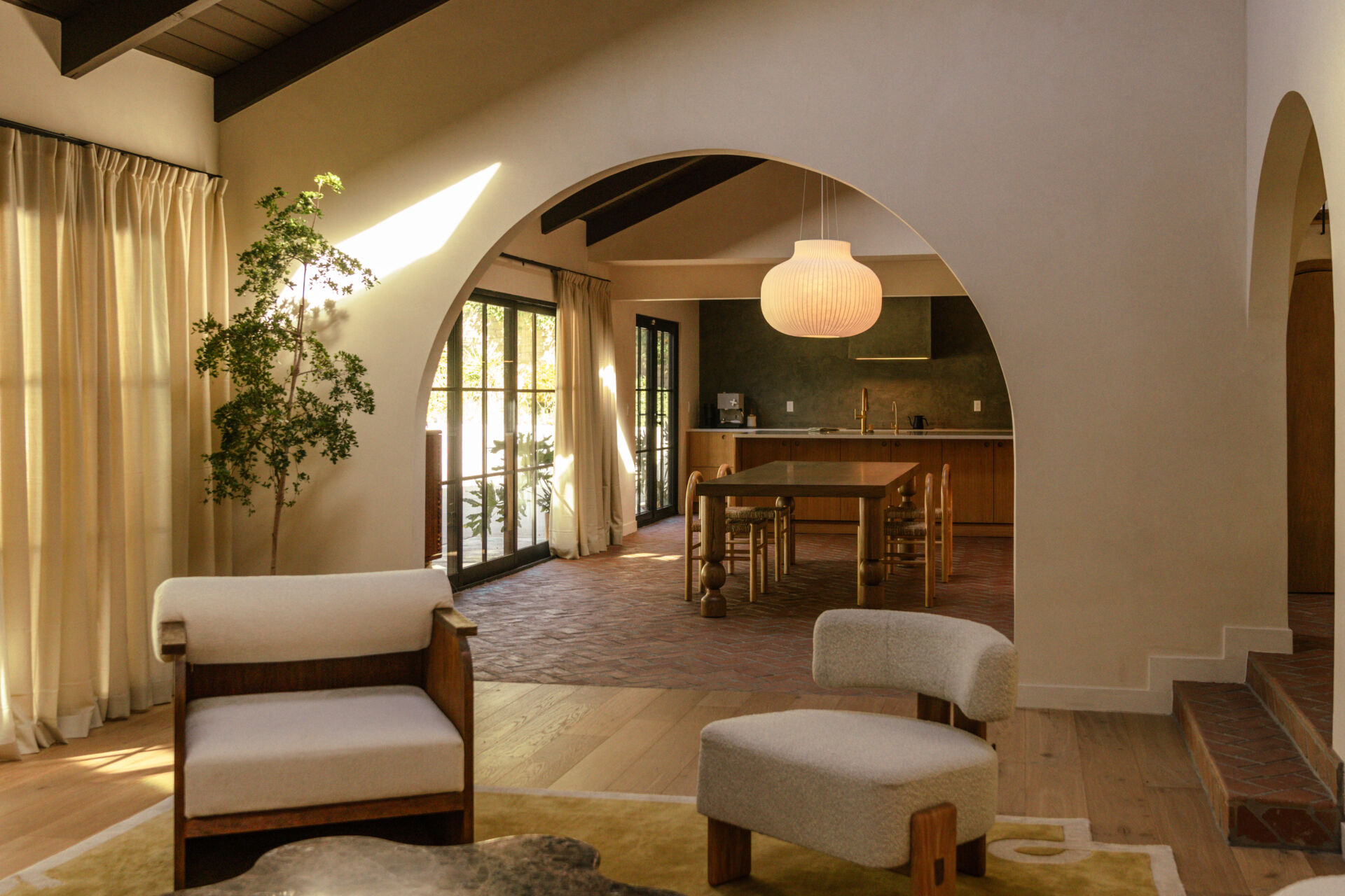 The transformation is comprehensive. A complete infrastructure overhaul includes new electrical and plumbing systems, HVAC, and a tankless water heater, while upgraded insulation and All Weather Architectural aluminum-clad double-pane windows ensure year-round comfort. New skylights draw natural light deep into the interior, illuminating walls finished in Portola limewash paint and Roman clay. Underfoot, the narrative shifts between warm Scandinavian oak hardwood and handmade brick floors, a textural dialogue that anchors the home’s material authenticity.