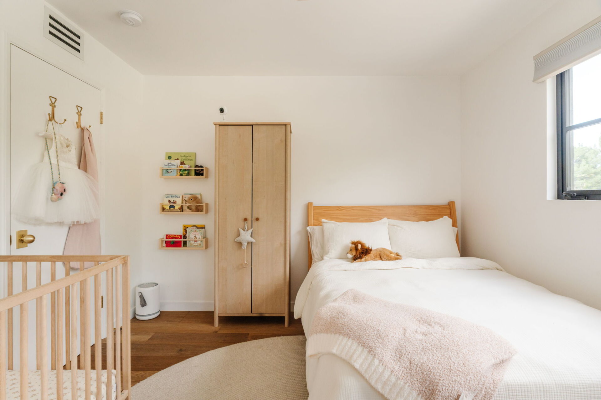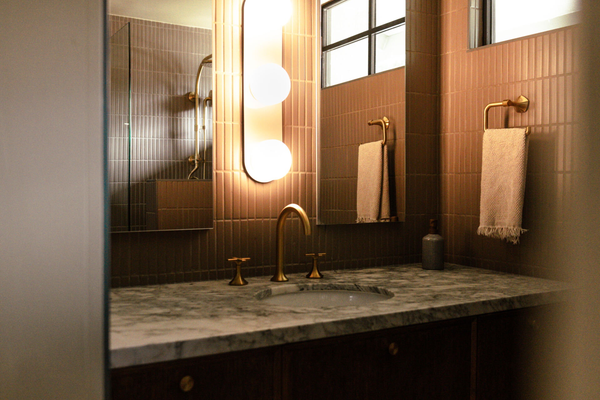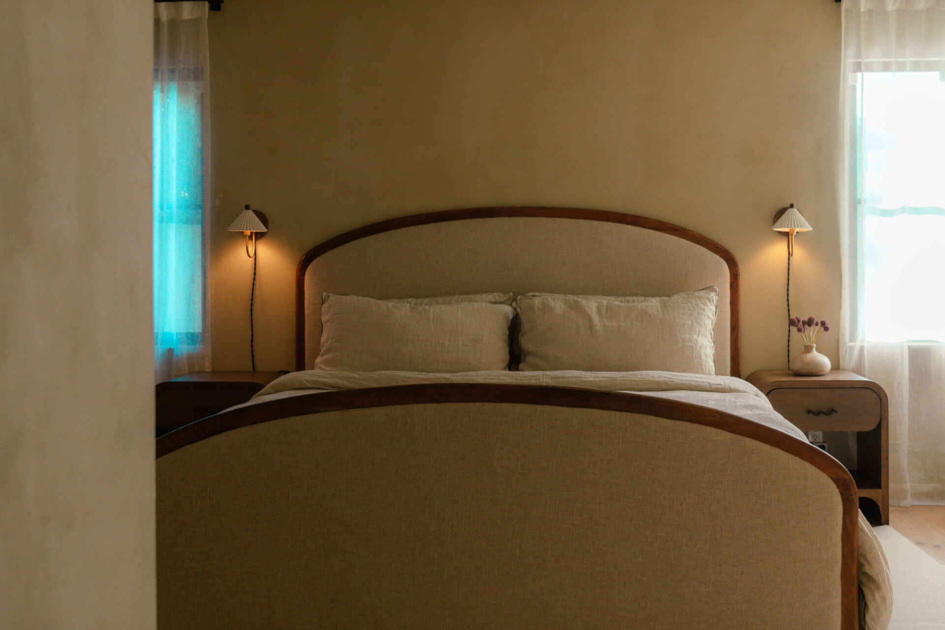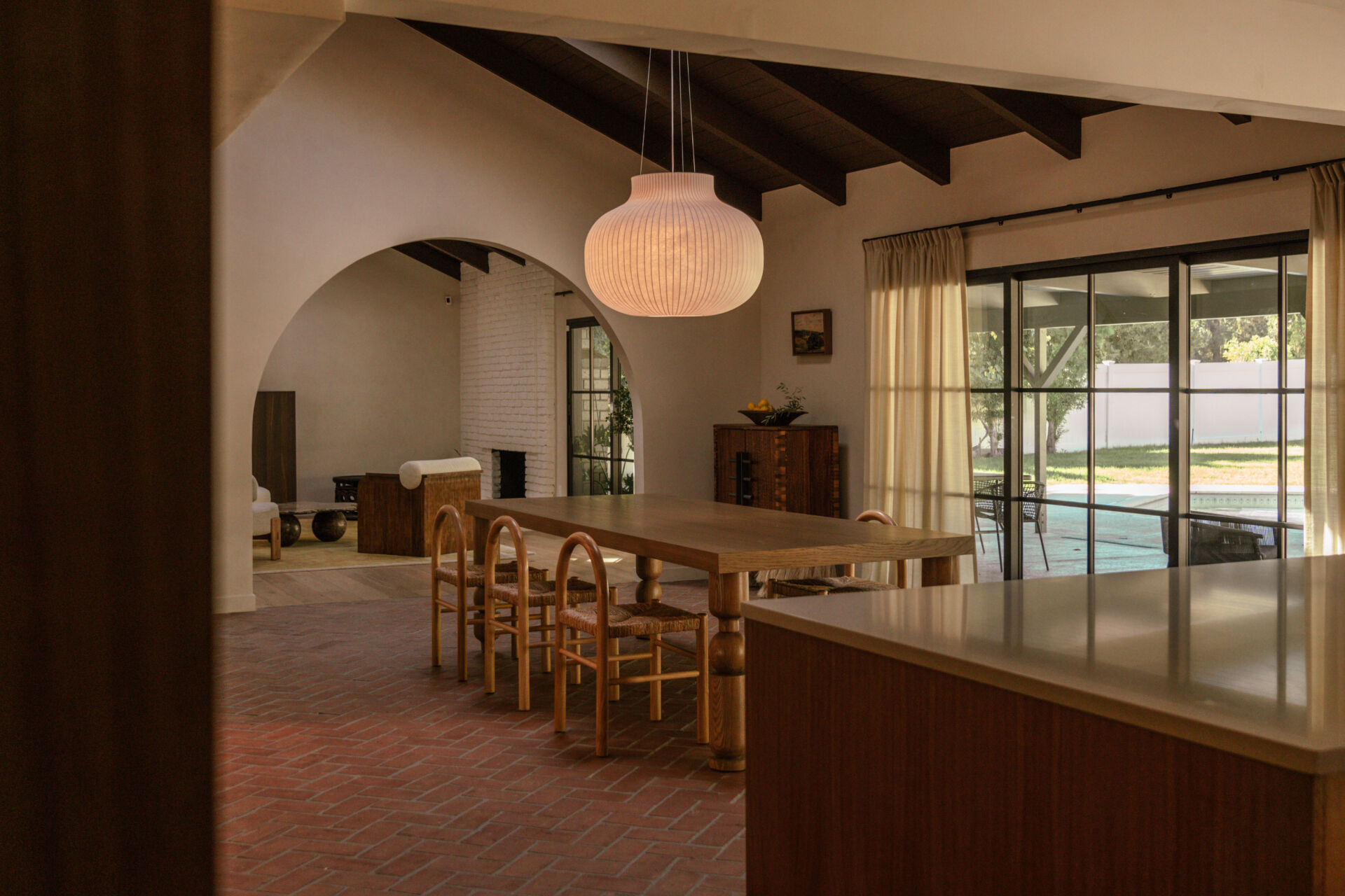 The transformation is comprehensive. A complete infrastructure overhaul includes new electrical and plumbing systems, HVAC, and a tankless water heater, while upgraded insulation and All Weather Architectural aluminum-clad double-pane windows ensure year-round comfort. New skylights draw natural light deep into the interior, illuminating walls finished in Portola limewash paint and Roman clay. Underfoot, the narrative shifts between warm Scandinavian oak hardwood and handmade brick floors, a textural dialogue that anchors the home’s material authenticity.